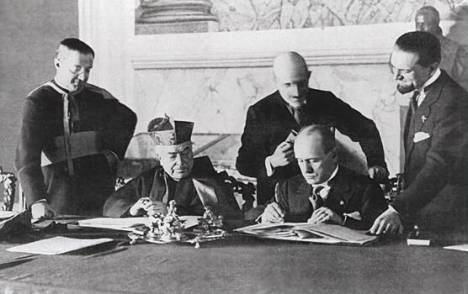 Na foto acima vemos a assinatura do tratado de Latrão feita por Mussolini e o Cardel Gasparri que promulgava a independência de uma Igreja (é pra rir?), na qual ela ganharia um território próprio e seu lider se tornaria REI. Surgia o Estado do Vaticano, ou seja o país da profecia (Vaticínio – Profecia).