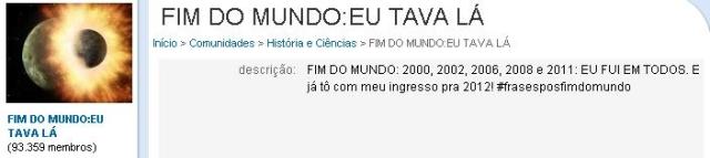 A comunidade do Orkut -“Fim do Mundo: Eu Tava Lá” tem mais de 90 mil membros. Tira sarro de todas as vezes, nos últimos 10 anos, que pregaram o fim do mundo. O último papelão se deu no dia 21 de maio desse ano.