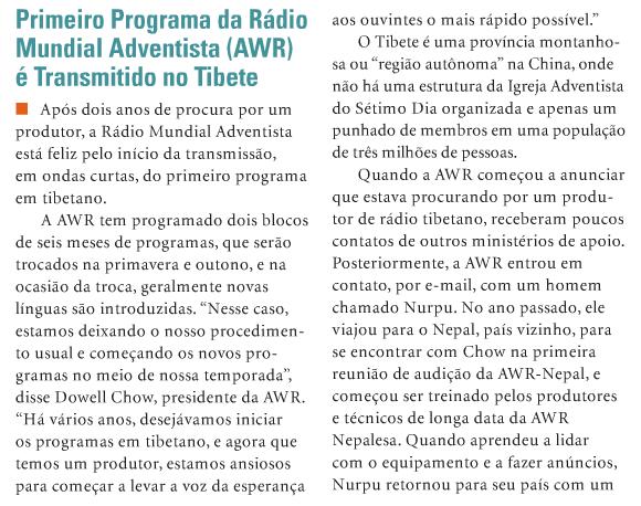 Para ler o resto clique aqui e acesse a Adventist World de Outubro de 2011.