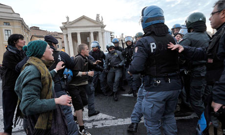 Com barracas de campanha coloridas, os manifestantes se agruparam na praça diante das janelas dos aposentos do papa Bento XVI. Um deles chegou a subir na árvore de Natal gigante que permanece no local após as festividades de fim de ano.