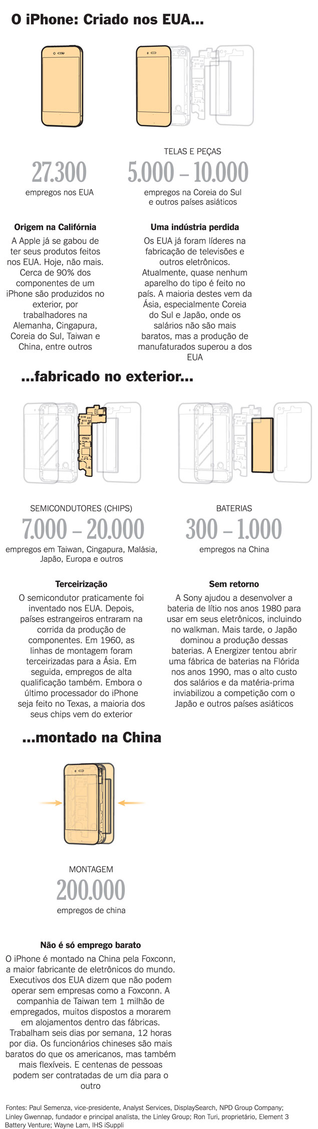 A Apple emprega 43 mil pessoas nos Estados Unidos e 20 mil em outros países. Muito mais pessoas trabalham para as empresas para as quais a Apple terceiriza funções: outras 700 mil pessoas trabalham como engenheiras e na fabricação e montagem de iPads, iPhones e de outros produtos da Apple. Mas quase todas elas trabalham para empresas com sede na Ásia, Europa e outros lugares, em plantas das quais todas as companhias de eletrônicos dependem para fabricar seus produtos.