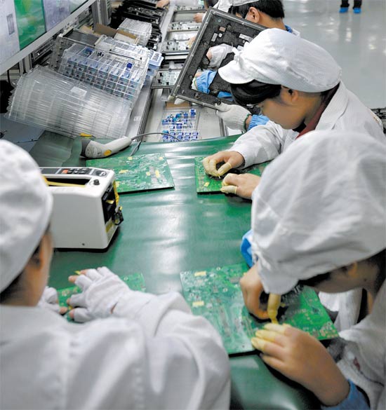 Trabalhadores manuseiam componentes eletrônicos em fábrica da Foxconn, em Shenzhen, na China