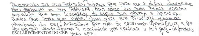 “Sobre a mesa colocaram Xerox de recados de twitter, o que me deixou indignada, como poderia estar sendo chamada para discutir ética, por denúncias de ateus, militantes gays, canabistas sem base legal alguma e que claramente me perseguem pelas minhas posições de direito de professar minha fé. Me senti perseguida, ouvi coisas absurdas, uma pressão psicológica que se eu não tivesse sanidade mental, teria me acovardado e desistido de minha fé.”