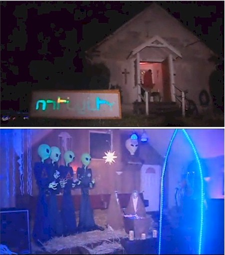 Em Portland (EUA), o artista Matt Henderson transformou uma igrejinha em Presépio de Aliens