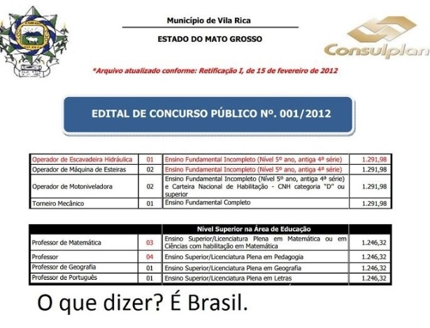 A comparação entre os salários oferecidos em um concurso público da prefeitura de Vila Rica, no Mato Grosso, para professores e operadores de máquinas teve repercussão negativa nas redes sociais. Enquanto a remuneração inicial oferecida para um operador de escavadeira hidráulica, com ensino fundamental incompleto, é de R$ 1.291,98, o salário para um professor com ensino superior é de R$ 1.246,32.