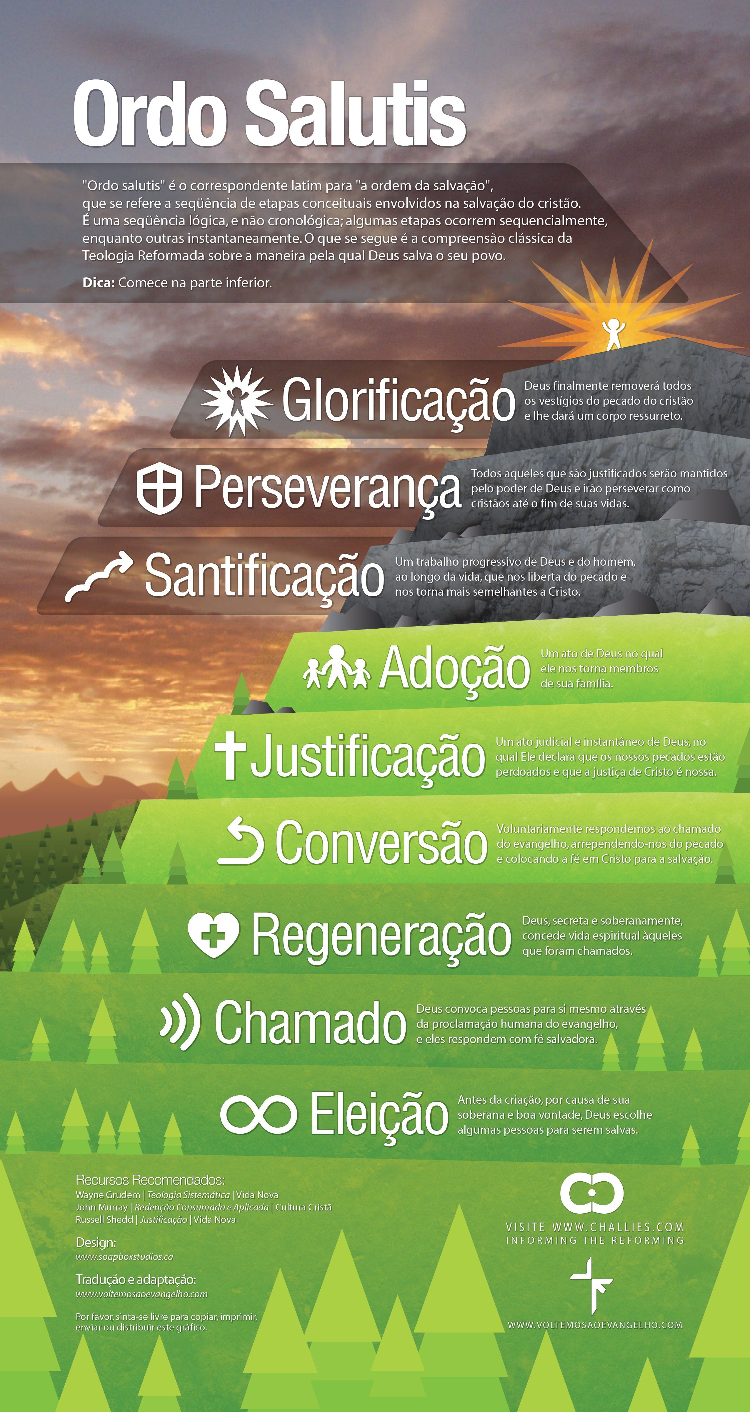 Tim Challies começou uma série chamada “Visual Theology”[Teologia Visual], tentando exibir teologia usando uma combinação de palavras e imagens. A primeira postagem da série é um infográfico sobre a ordem da salvação do cristão, o que é conhecido como “Ordo salutis” (correspondente latim para “a ordem da salvação”), que se refere a sequencia de etapas conceituais envolvidos na salvação do cristão. É uma sequência lógica, e não cronológica; algumas etapas ocorrem sequencialmente, enquanto outras instantaneamente. O que se segue é a compreensão clássica da Teologia Reformada sobre a maneira pela qual Deus salva o seu povo.