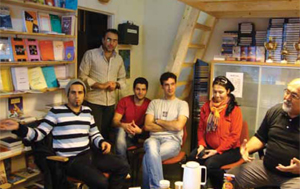 Foto: Jahan em sua casa, com alguns ex-muçulmanos. Ao lado é possível ver o material utilizado no discipulado.