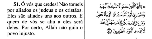 Sura 5:49 “Ó fiéis, não tomeis por confidentes os judeus nem os cristãos; que sejam confidentes entre si. Porém, quem dentre vós os tomar por confidentes, certamente será um deles; e Deus não encaminha os iníquos.”