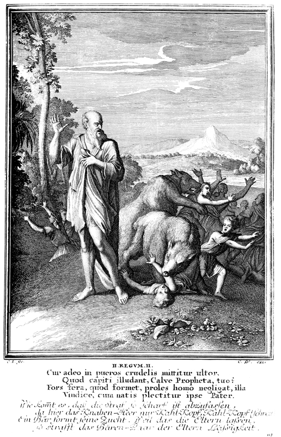 (II Reis 2:23) – Então [o profeta Elias] subiu dali a Betel; e, subindo ele pelo caminho, uns meninos saíram da cidade, e zombavam dele, e diziam-lhe: Sobe, careca; sobe, careca! E, virando-se ele para trás, os viu, e os amaldiçoou no nome do SENHOR; então duas ursas saíram do bosque, e despedaçaram quarenta e dois daqueles meninos.