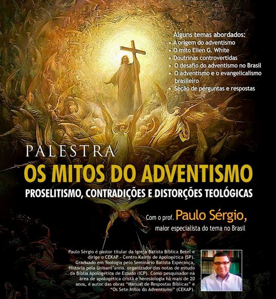 O Pastor Paulo Sérgio da Igreja Batista ”Bíblica” Betel criou um Ministério de ataque a Igreja Adventista do Sétimo Dia. Escreveu um livro chamado Os 7 Mitos do Adventismo tentando destruir a crença de que essa é a Igreja de Deus na Terra. Não satisfeito, está dando palestras sobre o assunto. Veja o cartaz de sua propaganda:
