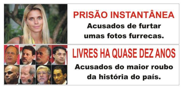 Uma simples amostra do como a justiça e os órgãos investigativos funcionam em nosso pais, muitos vão dizer “mas é crime também” só que no primeiro caso apenas afeta uma única e exclusiva pessoa já nos segundo afeta TODOS nós, pois todos fomos de uma forma ou outra prejudicados e roubados por todos os envolvidos no mensalão, mas a este fato aparentemente incomoda muito pouco…. e ainda no primeiro caso tenho 99% de certeza que isso tudo não passou de uma jogada da globo justamente para desviar a atenção da massa.
