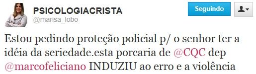 Marisa Lobo afirmou em uma publicação direcionada ao pastor e deputado federal Marco Feliciano (PSC-SP) que pedirá proteção policial como cautela para evitar maiores transtornos. “Estou pedindo proteção policial p/ o senhor ter a ideia da seriedade. Esta porcaria de @CQC, dep. @marcofeliciano, induziu ao erro e à violência”, publicou.