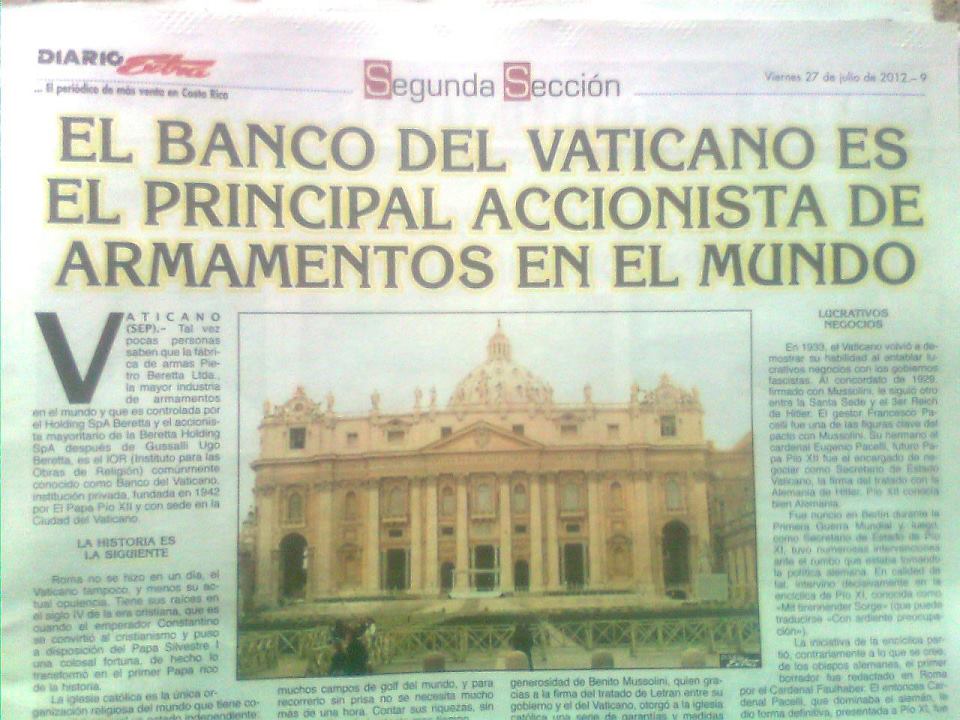 Alguns Sites na Internet denunciaram que a fábrica de armas Pietro Beretta ltda (uma das maiores indústria de armamentos do mundo) teria como segundo acionista majoritário (após Gussalli Ugo Beretta), o IOR (Instituto para Obras da Religião), ou seja, o Banco do Vaticano fundado em 1942 pelo Papa Pío XII. Embora a Igreja negue, há evidências de ligações do Banco do Vaticano com terrorismo, tráfico de armas e lavagem de dinheiro, já documentadas na imprensa.