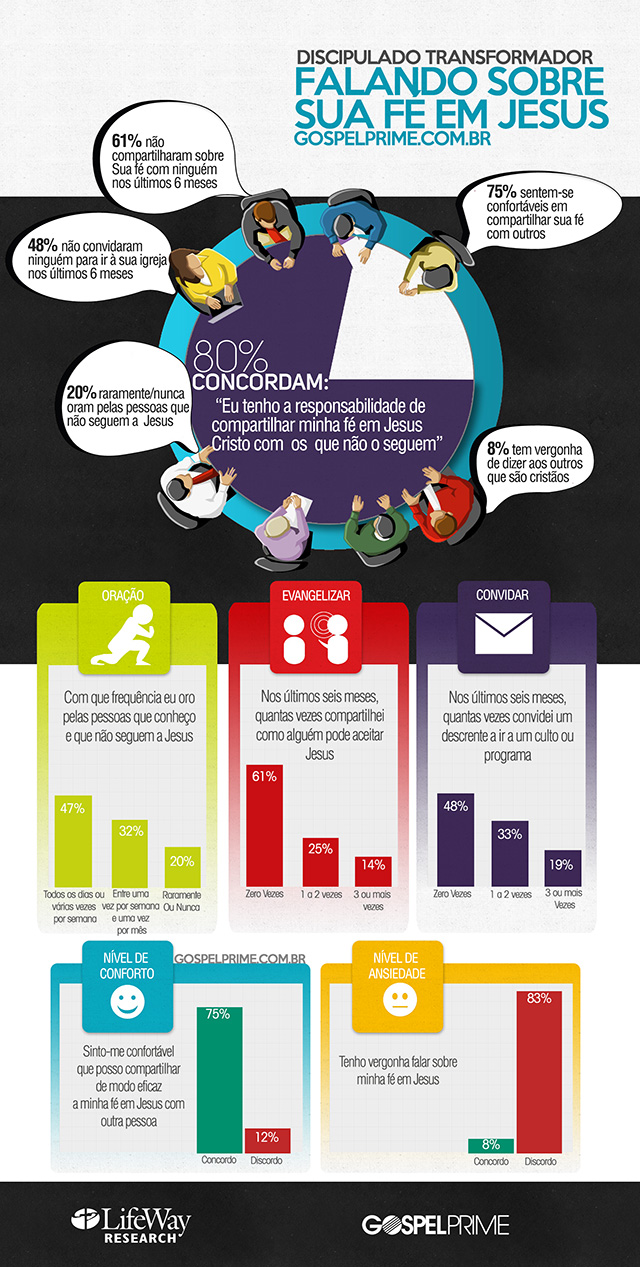 Dentre os oito, “compartilhar sobre Cristo” teve a menor pontuação média entre os participantes que se identificaram como membros de igrejas evangélicas . Cerca de 75% dizem estar satisfeitos com sua capacidade de comunicar o evangelho , enquanto apenas 12% não se sente confortável em compartilhar sobre sua fé.