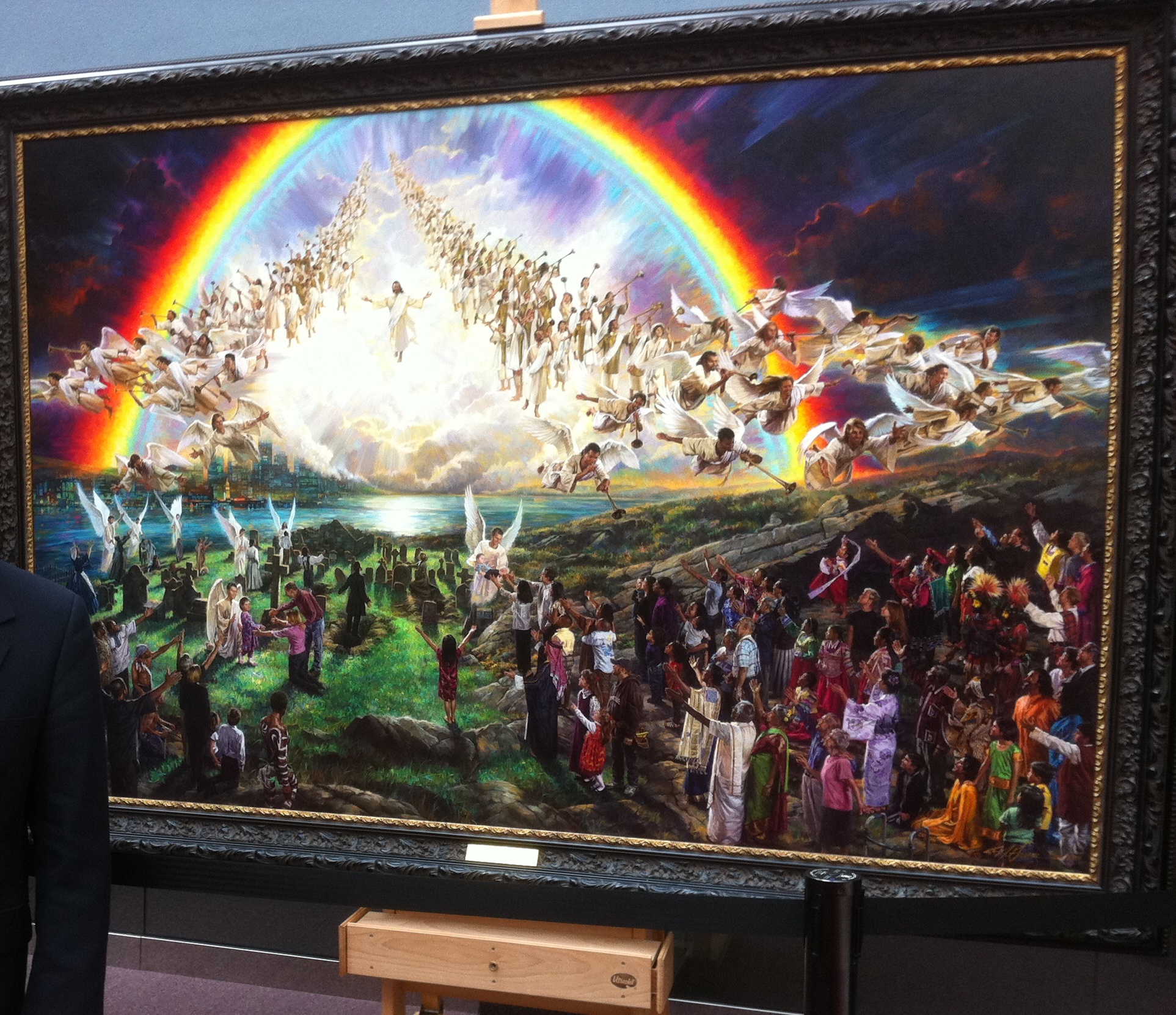 Clique na imagem e veja os detalhes do artista. Ao que parece, ele quis mostrar que há humanos no Céu, que voltam com Jesus junto com os anjos. Percebam que há humanos glorificados voltando com Jesus e não apenas anjos. A Bíblia diz que Enoque e Elias foram levados vivos e alguns (entre eles Moisés) foram ressuscitados e levados para o Céu.