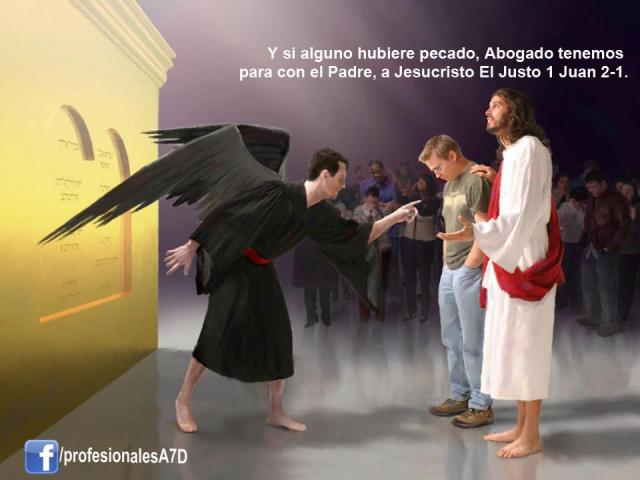 Uma lista ilustração publicada no facebook na página dos profissionais adventistas mostra Jesus como nosso advogado e Lúcifer como o acusador. Em frente deles, a norma do julgamento, os 10 mandamentos numa parede de pedra. E em cima dessa parede que na verdade é um Trono está Deus Pai, (pra direção onde Cristo olha).
