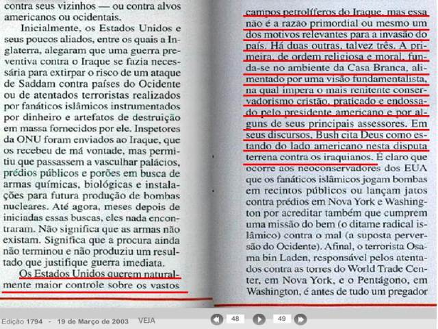 Na época da invasão ao Iraque (2003), a revista VEJA publicou algumas matérias analisando as verdadeiras razões que estavam motivando os EUA a invadir aquele país. Pode-se ver que, por trás dos bastidores, a verdadeira razão estava no campo RELIGIOSO. De lá para cá, mesmo com a mudança de chefe na Casa Branca, outros países também foram invadidos e outros “argumentos” foram usados para convencer a opinião pública. No entanto, a real motivação continua a mesma. Só faltou VEJA desmascarar o protagonista oculto mais interessado neste objetivo, o qual tomou de assalto os EUA a partir dos principais centros de influência (partidos políticos, Suprema Corte, universidades, sindicatos, bancos, mídia, Forças Armadas…): o Vaticano…
