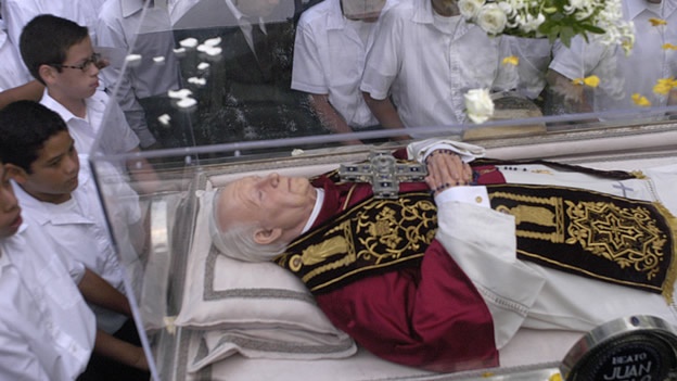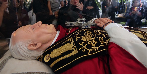 Isso está acontecendo quase despercebidamente desde o ano passado! Fizeram uma estátua de Cera de João Paulo II como se ele estivesse em um caixão! A estátua já passou por algumas cidades do México e América Central, e continuará percorrendo outros diversos países, como o Brasil.