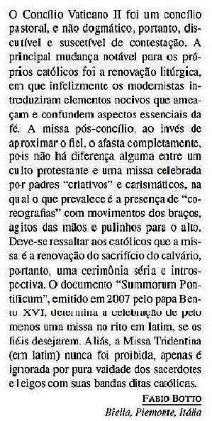 Na Veja de 24 de Outubro de 2012 (seção de Cartas) um Católico lembra que a missa não é a mesma coisa que um culto protestante. Seria a RENOVAÇÃO OU REPETIÇÃO do Sacrifício de Cristo. Essa ideia é condenada pelas escrituras: