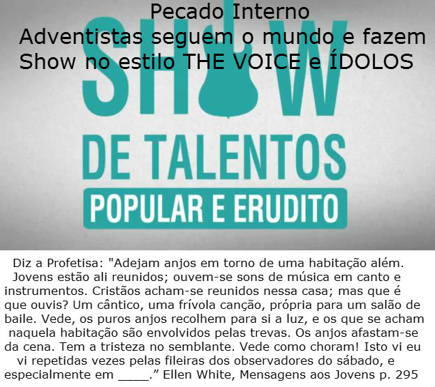 “As coisas eternas tem pouco peso para a juventude. Anjos de Deus choram quando registram palavras e atos de professos cristãos. Adejam anjos em torno de uma habitação além. Jovens estão ali reunidos; ouvem-se sons de música em canto e instrumentos. Cristãos acham-se reunidos nessa casa; mas que é que ouvis? Um cântico, uma frívola canção, própria para um salão de baile. Vede, os puros anjos recolhem para si a luz, e os que se acham naquela habitação são envolvidos pelas trevas. Os anjos afastam-se da cena. Tem a tristeza no semblante. Vede como choram! Isto vi eu repetidas vezes pelas fileiras dos observadores do sábado, e especialmente em _____________.” (Testimonies vol. 1, pág. 506)