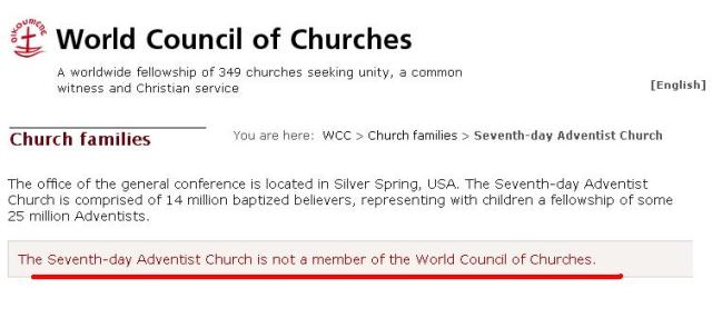 Fonte A Igreja Adventista se considera a igreja verdadeira, portanto não tem nada o que aprender com as demais igrejas, mas apenas tem a ensinar. Portanto, a denominação se recusa a fazer parte do conselho mundial de igrejas.