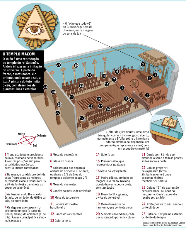 Há hoje 58 deputados federais maçons no Congresso Nacional e outros seis senadores. “Uma das minhas propostas é organizar a bancada da maçonaria”, afirma Mozarildo, senador da República. “Imagine só: seria maior que a de muitos partidos de hoje.” No dia 9 de março, cerca de 40 mil homens que frequentam rituais secretos semanais, usam códigos para reconhecimento mútuo e se tratam socialmente como “irmãos” irão às urnas para escolher seu líder máximo. Em quase 3 mil lojas maçônicas pelo país, os maçons que ostentam o título de “mestre” do Grande Oriente do Brasil (GOB) –o maior ramo da maçonaria brasileira– irão escolher seu próximo soberano grão-mestre geral. Cheia de simbolismos, a organização reproduz internamente a hierarquia institucional da República, com deputados, juízes, governadores e outros. Dentro da instituição, e guardadas as proporções, o cargo em disputa equivale ao da presidente Dilma Rousseff. “A maçonaria precisa voltar a ser parte da elite estratégica do país; hoje somos só uma elite convencional”, afirma ao (folha.com), Benedito Marques Ballouk, membro do Tribunal de Contas do Município de São Paulo.