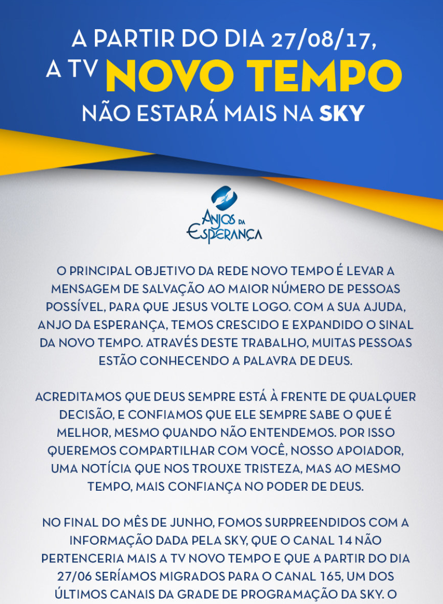 Após ter seu número de canal trocado de maneira arbitrária e jogado para o fim da fila, a novo tempo decidiu romper com a Sky