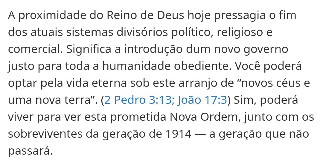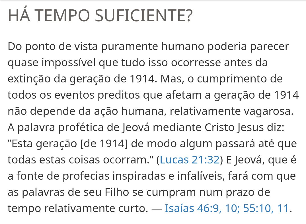 Houve uma profecia feita pelas testemunhas de Jeová. De que o mundo chegaria ao fim antes que morresse a última pessoa nascida em 1914. Era conhecido como a geração de 1914. Bem estamos em 2020! Quantos ainda estão vivos?