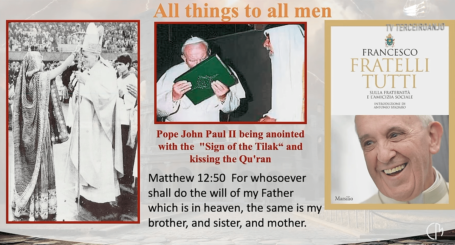 Papa João Paulo segundo já chamado de “Santo João Paulo segundo. Beijando o Corão (que nega que Jesus seja Deus e nega que morreu na cruz) e recebendo benção de sacerdote budista..