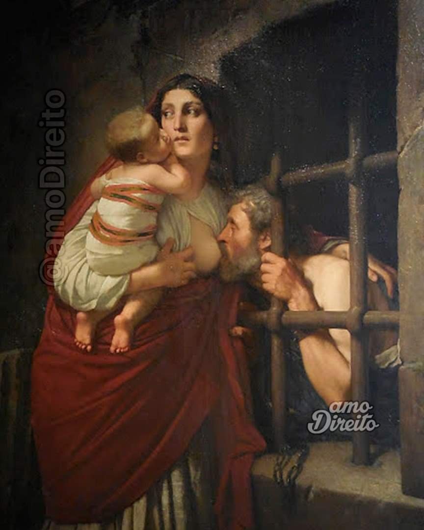 Na verdade esta obra de arte conta uma história trágica. Um pobre idoso, da época de Luís XIV, foi preso por roubar um pão e então condenado a morrer de fome. Sua filha, ao saber da dor de seu pai, pediu permissão para visitá-lo. A cada visita, os guardas revistavam adequadamente a jovem e o bebê de seis meses em seus braços para que nenhum tipo de comida fosse levado ao pai. E assim, lhe permitiram visita uma vez ao dia.