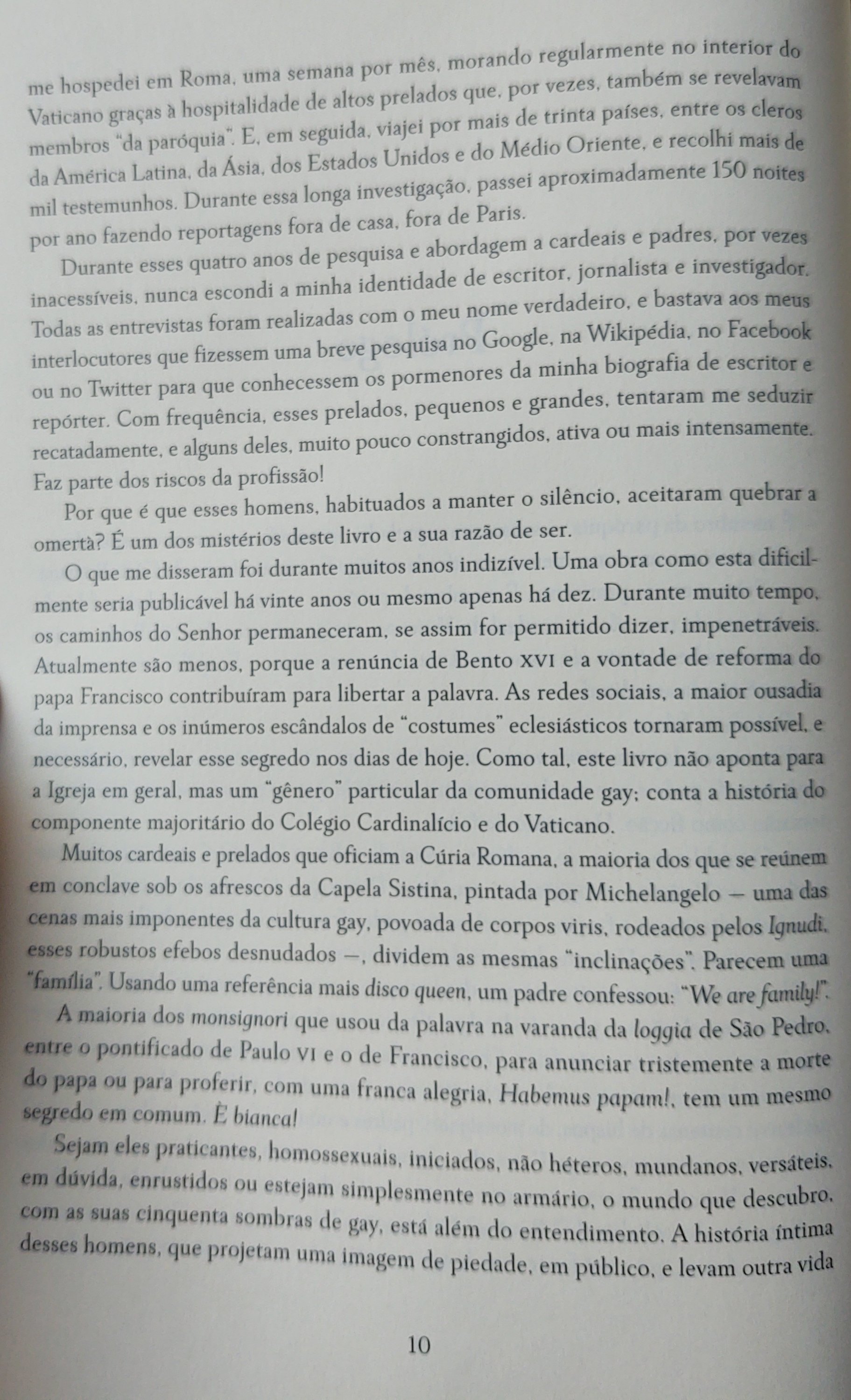 Observação: No Armário do Vaticano é uma reportagem investigativa que demorou 4 anos para ficar pronta. No total foram realizadas 1500 entrevistas: 41 cardeais, 52 bispos e monsignori, 45 Núncios apostólicos, secretários da nunciatura ou embaixadores, 11 guardas suíços e mais de 200 padres católicos e seminaristas. Para realizar essa investigação viajei regularmente para Roma me hospedando por lá em média 1 semana por mês, entre 2015 e 2018. Também pude me instalar algumas vezes no interior do Vaticano e fiz pesquisas em 15 cidades italianas. Também realizei minha investigação em mais de 30 países para onde retornei diversas vezes (No Brasil Belém, Brasília, Porto Alegre, Recife, Rio e São Paulo em 2014, 2015, 2016 e 2018). A maior parte das entrevistas foi gravada com total acordo com os interlocutores ou efetuada na presença de um investigador ou de um tradutor, que as testemunharam, no total dispondo de 400 horas de gravações, 80 blocos de notas de várias centenas de fotos e selfies Cardinalícas.
