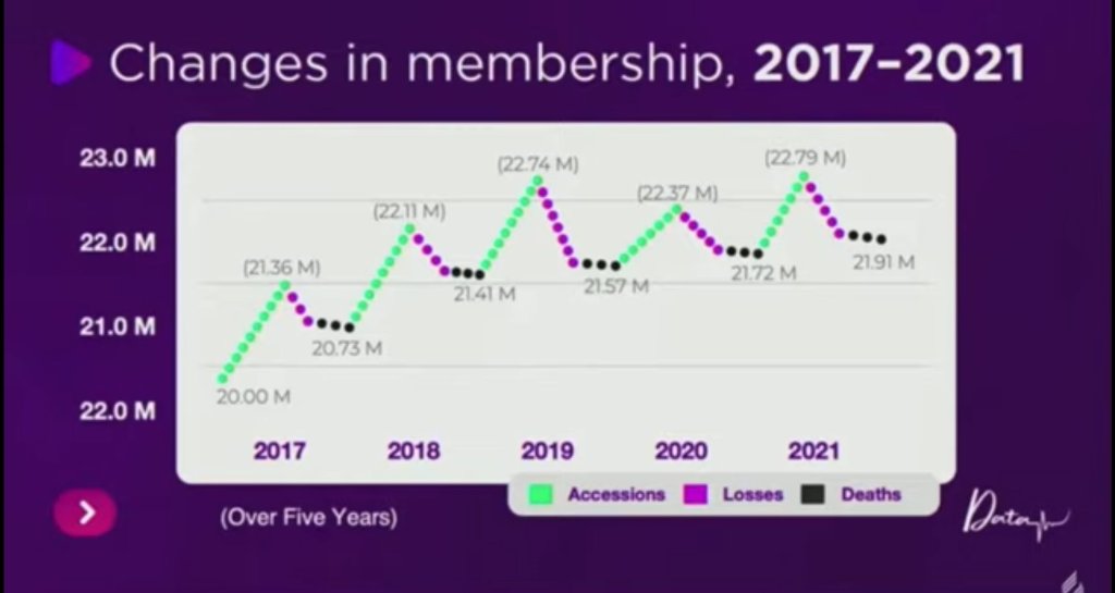 Pela primeira vez a igreja teve queda de membros. De 22,79 milhões para 21,91 milhões.