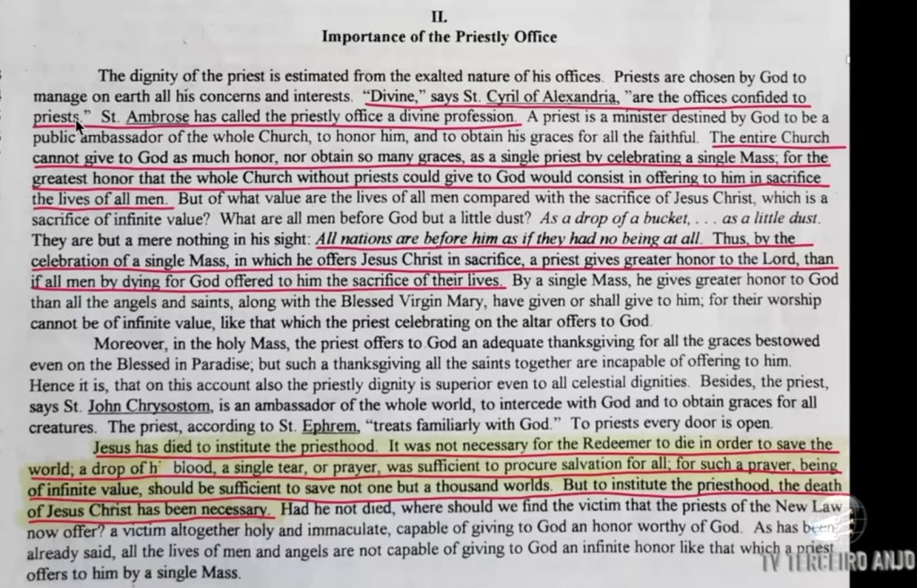 Tradução: São Ambrósio chamou o cargo de sacerdote de profissão divina. Toda a igreja não pode dar a Deus tanta honra e nem obter tantas graças como dar um unico padre ao celebrar uma missa. A maior honra que uma igreja sem um padre poderia dar a Deus seria oferecer em sacrifício Todas as vidas de todos os homens. Diante do padre todas as nações são Nada. Assim pela celebração de uma única missa que ele oferece Jesus em sacrifício, o padre oferece mais honra a Deus do que se toda a humanidade oferecesse suas vidas em sacrifício a Ele. Jesus morreu para instituir o sacerdócio. Não era necessário que Jesus morresse para salvar o mundo mas uma gota do seu sangue, uma única lágrima e oração era o suficiente para salvar a todos, e não apenas um, mas milhares de mundos.