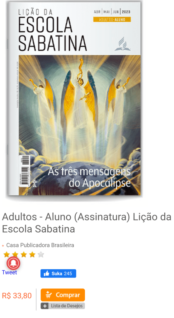 Como não li ainda, não sei a qualidade desse lançamento (As 3 mensagens angélicas). Espero que tenham caprichado porque serviria de bom resumo para novos convertidos. A compilação deve ter sido encomendada como adendo ou anexo a nova lição da escola sabatina do segundo trimestre de 2023 justamente sobre o mesmo tema.