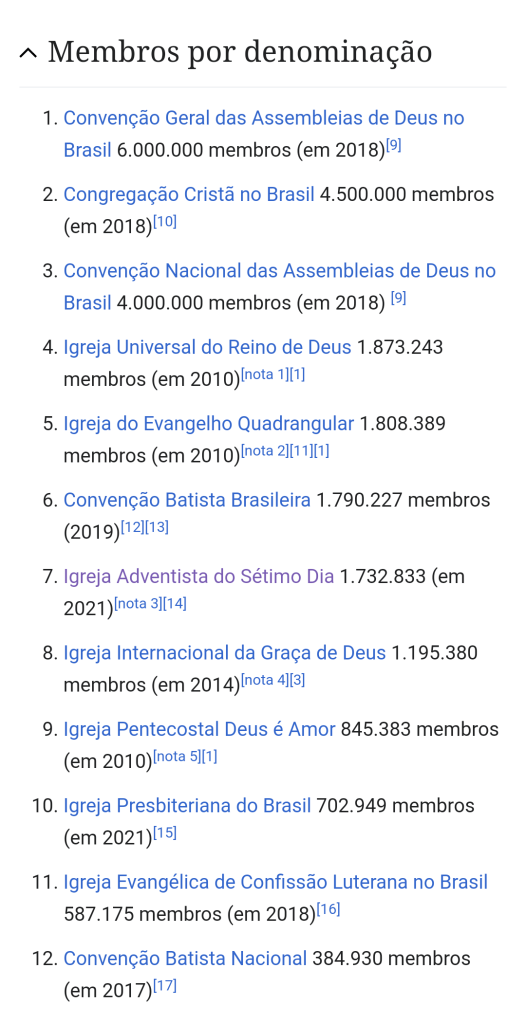Fonte https://pt.m.wikipedia.org/wiki/Lista_de_denomina%C3%A7%C3%B5es_protestantes_no_Brasil_por_n%C3%BAmero_de_membros