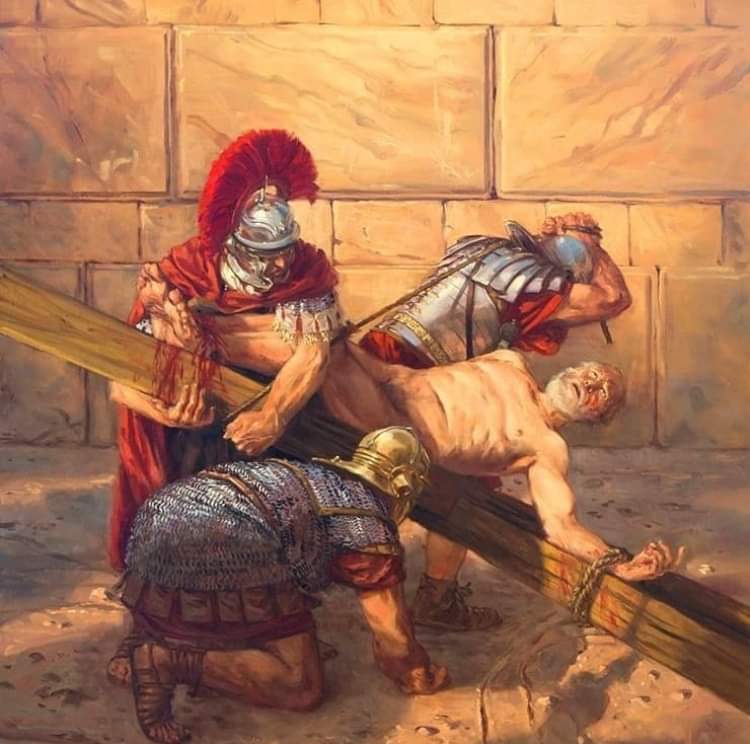 Pedro, como um estrangeiro judeu, foi condenado a ser açoitado e crucificado. Na perspectiva desta terrível morte, o apóstolo lembrou seu grande pecado em haver negado a Jesus na hora de Seu julgamento, e seu único pensamento, foi que ele era indigno de morrer da mesma maneira que seu Mestre. Pedro havia-se arrependido sinceramente daquele pecado, e tinha sido perdoado por Cristo, como se pode ver pela alta missão a ele dada para alimentar as ovelhas e cordeiros do rebanho. Ele, porém, nunca pôde perdoar a si mesmo. Nem mesmo o pensamento das agonias da última e terrível cena puderam diminuir a amargura de sua tristeza e arrependimento. Como último favor, rogou de seus algozes que fosse pregado na cruz de cabeça para baixo. O pedido foi atendido, e desta maneira morreu o grande apóstolo Pedro.