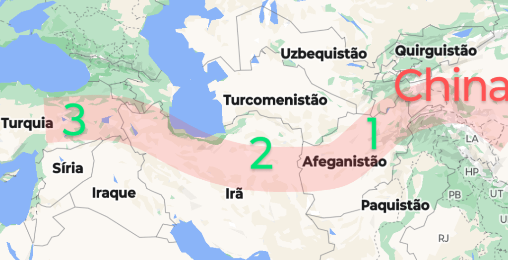 Algo muito curioso sobre a geopolítica mundial é que apenas dois países separam a China da Europa: Afeganistão e Irã. A Turquia não faz parte da União Europeia mas faz parte da otan, a aliança militar. Então tecnicamente quando você atravessar a fronteira do Irã para a Turquia você já está na Europa, (embora geograficamente é necessário passar o estreito da cidade de Istambul).