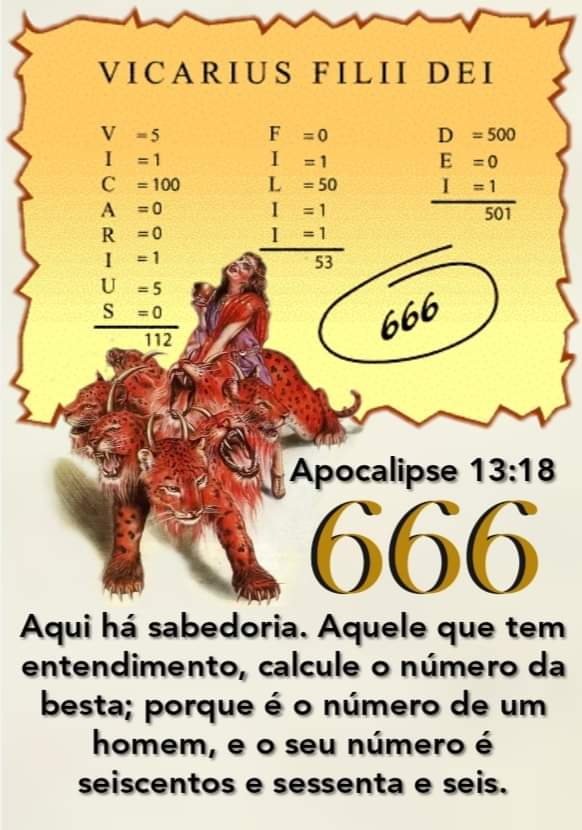 “O título do papa de Roma é Vicarius Filii Dei, e se tomardes as letras que este título representa em valores latinos numerais (em maiúsculas) e as somardes, tereis o número 666” (Our Sunday Visitor, 15 de novembro de 1914).