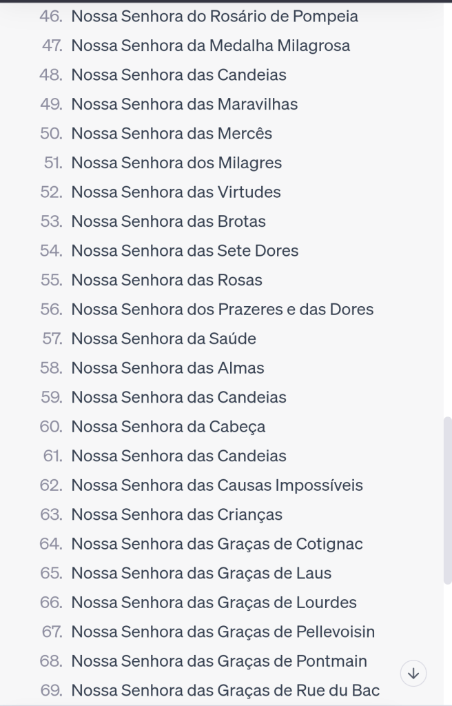 Como se não bastasse o SENHORIO aplicado a outra pessoa, deram a Maria centenas de títulos dependendo do local das aparições ou o conteúdo delas. Maria virou Senhora Aparecida, da Glória, das Dores, de Fátima, de Guadalupe, novamente copiando a bíblia que dá títulos divinos para Deus (Elohim, El Shaday, Emanuel, Mikael-Miguel, Eu Sou, etc).