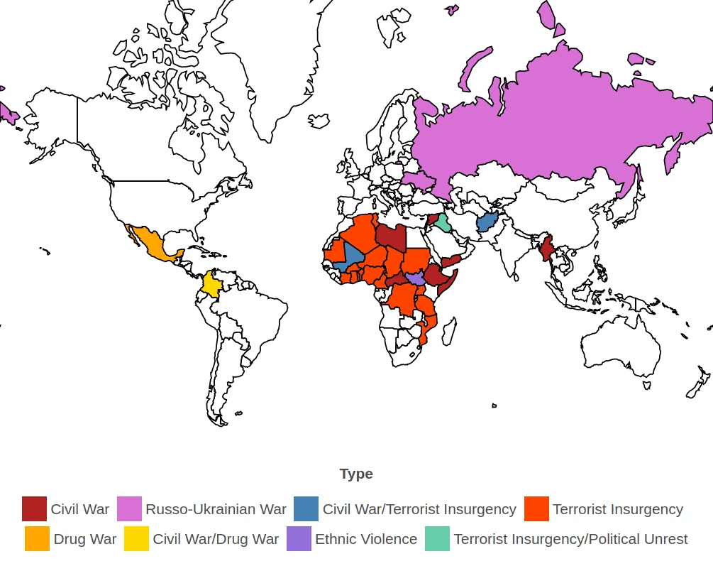 Azul: Afeganistão e Mali: Guerra civil e insurgência terrorista.