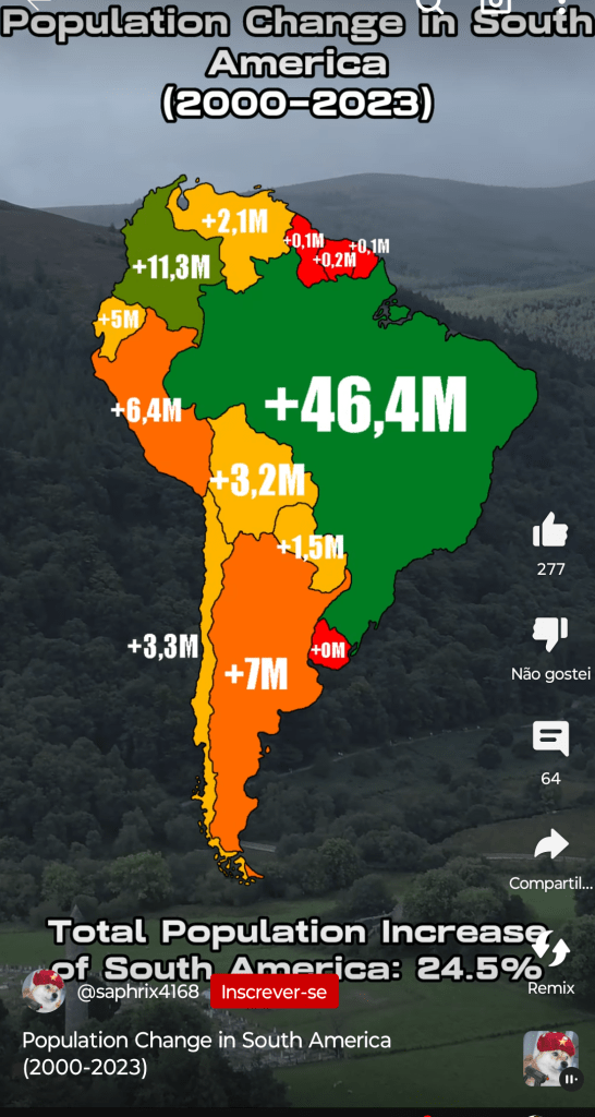 Nos últimos 23 anos a população da América do Sul está quase estabilizada crescendo pouco. O detalhe no mapa é para o crescimento quase zero de Uruguai, Guiana, Suriname e Guiana Francesa. O Brasil embora tenha tido um bom crescimento deverá cair mais ainda nos próximos anos. Isso é bom para o crescimento do evangelho que não precisa se preocupar com a população dobrando ou triplicando a cada 50 anos.