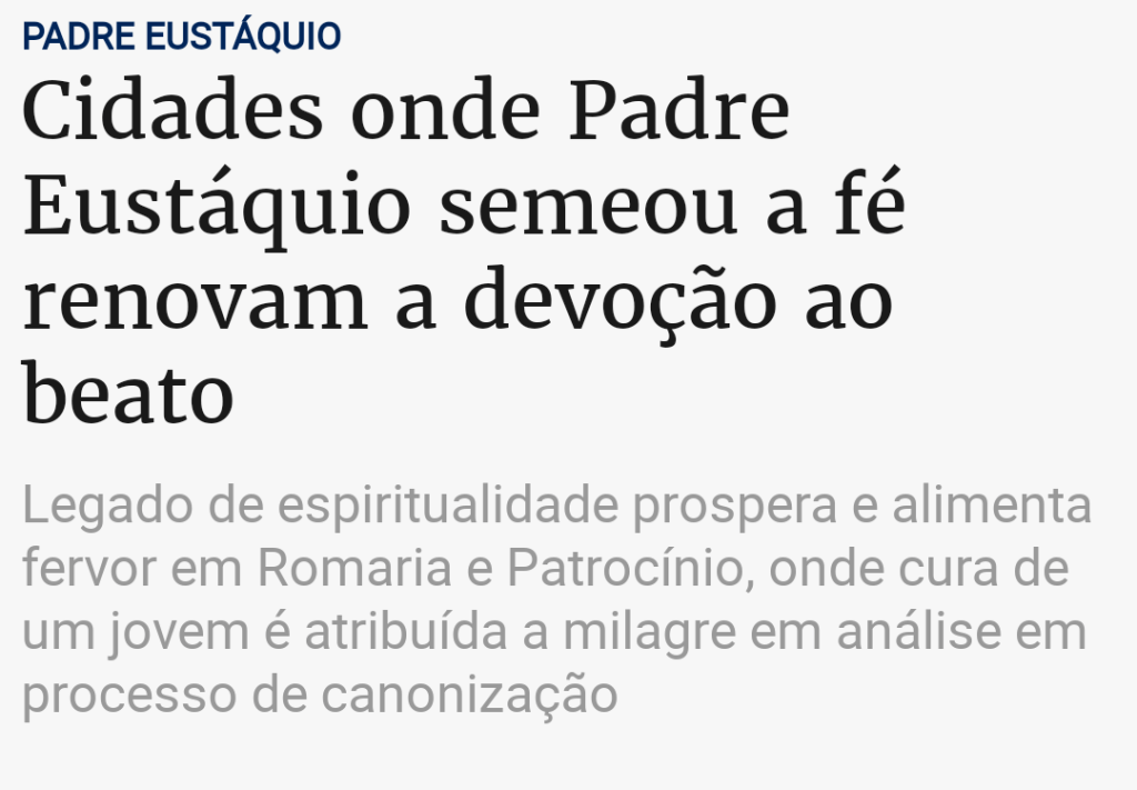 Como não se cansam de criar santos e santas e como aqueles santos antigos e europeus saem de moda, os católicos de Minas Gerais buscam canonizar Padre Eustáquio. Logo terão mais uma pessoa para receber suas rezas indo contra 2 ensinamentos da Biblia: que Cristo somente ressuscitará os mortos no último dia (portanto os santos não estão vivendo nos céus) e que apenas a Deus devemos dar glória, orações e cânticos.