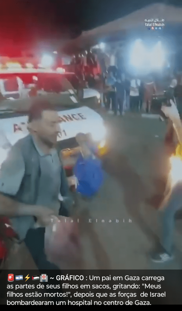 Pai carrega sacos com pedaços dos filhos mortos em Gaza