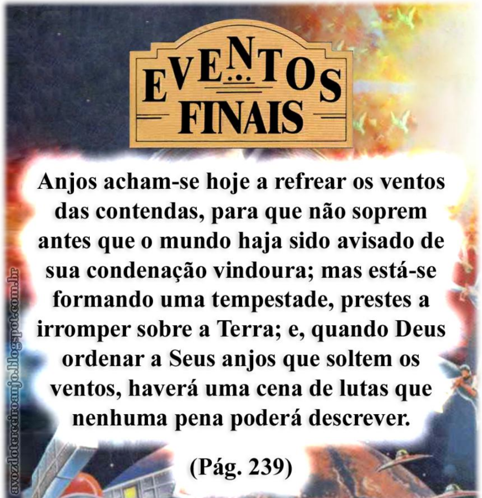 Quatro poderosos anjos ainda estão retendo os Quatro ventos da Terra . Terrível destruição é proibida de manifestar-se em cheio. Os … ventos serão a incitação das nações para um combate fatal, enquanto os anjos seguram os Quatro ventos, proibindo que o terrível poder de Satanás seja exercido em sua fúria até que os servos de Deus sejam selados em sua fronte. – RH, 07-06-1887. Maranata página 173.