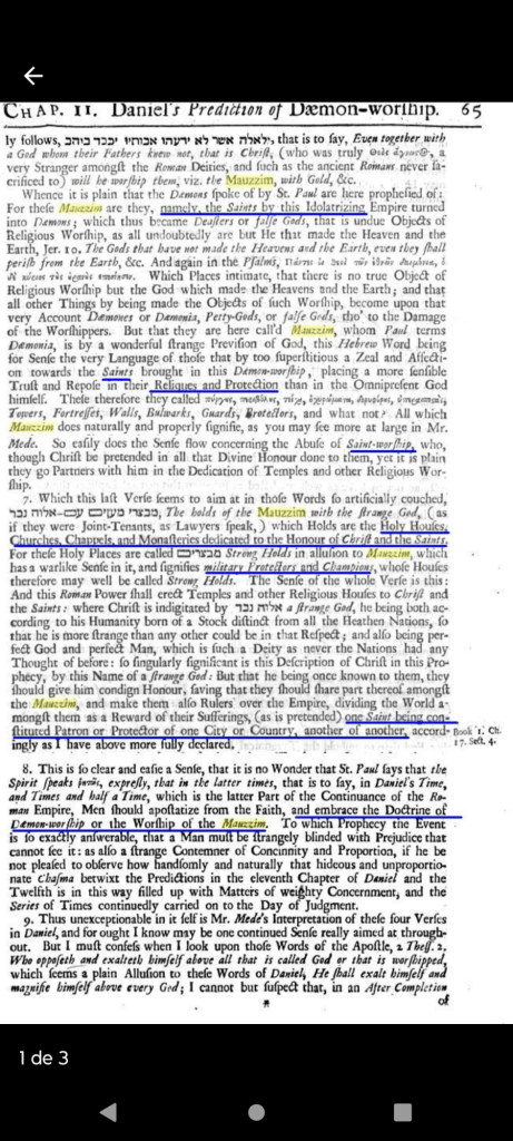 Comentando Daniel 11:38, Henry More (1614-1687) chega a conclusão de que o deuses das cidades são os santos do catolicismo. Quando foi criado um padroeiro para cada cidade, os homens serviram aos demônios, dando culto a eles, ao invés de dar culto a Cristo.