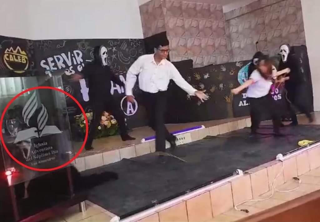 “Esta cena dramática que estamos vendo ocorreu em uma igreja adventista localizada na cidade de Guayaquil, Equador. Você pode assistir a uma apresentação teatral – dança incluída – onde os personagens aparecem vestidos com a típica máscara “Ghostface”. De acordo com uma pesquisa na Internet, “Ghostface” é um personagem fictício, um assassino que usa truques peculiares para caçar e matar suas vítimas de maneira criativa, no estilo de um filme de terror. Evidentemente, e de acordo com o que se pode ver no vídeo, esta representação particular foi realizada no púlpito, no interior do templo e na programação do sábado.” [1]