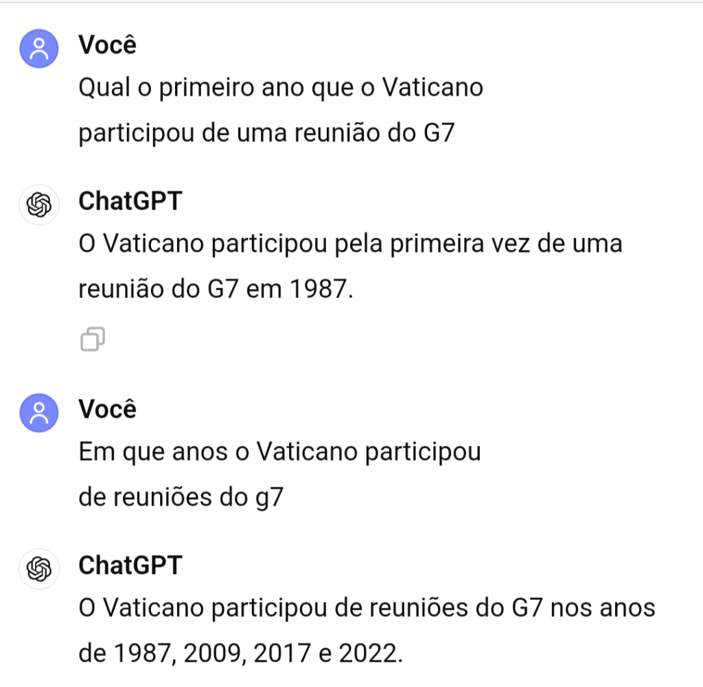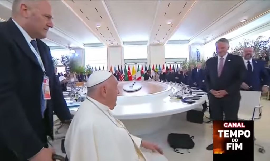 O Vaticano sentou pela quinta vez entre os líderes do G7. O fato do Papa estar na cadeira de rodas obrigou os líderes mundiais a se curvar. É o único de branco ao lado da mulher (presidente da UE). Muito profeticamente representativo, visto que a “mulher” é símbolo da Igreja na Bíblia. O convite se tornou frequente após 2009.
