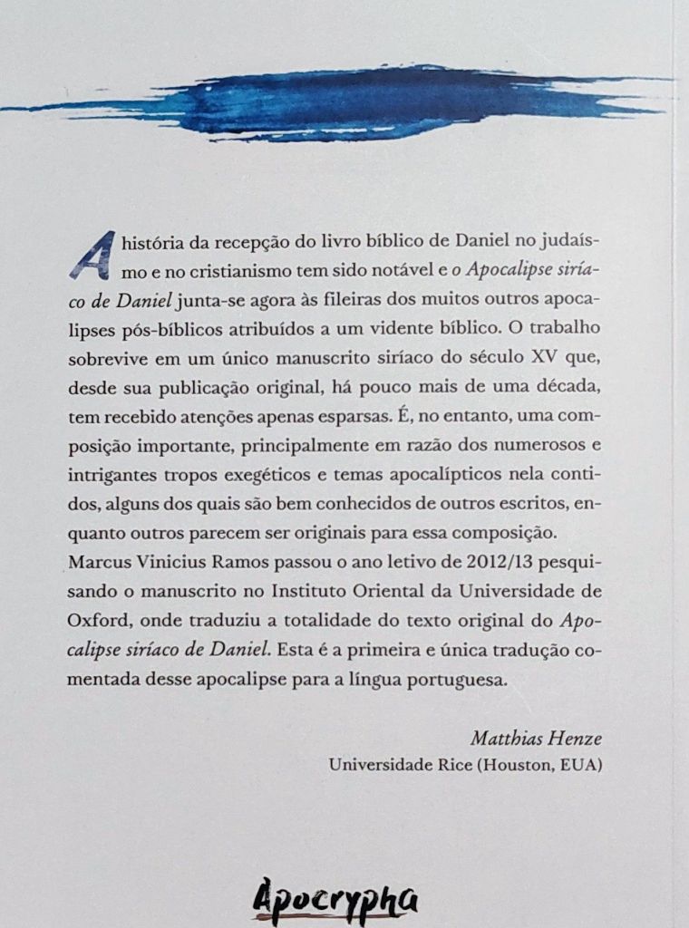 Somos introduzidos a um texto que ensina o leitor que o chifre pequeno de Daniel 7 é o rei Antioco Epifânico IV, que é um rei grego que sacrificou porcos e colocou imagens de deuses dentro do Templo de Jerusalém. No entanto, o autor Marcus V. Ramos, por desconhecimento, não parece ver que se os cristãos do Império Romano Oriental já entendiam que o Império Romano era a quarta besta de Daniel, o chifre pequeno jamais pode ser um rei grego (pois o chifre pequeno sobe do quarto animal, Roma, e não do terceiro animal, A Grécia). Uma parcela dos protestantes entendem que o chifre pequeno é o papado, pois é o herdeiro do Império Romano ocidental. A introdução infelizmente é superada mas pode enganar quem nunca estudou as profecias da Bíblia. Também fica minha crítica que a introdução de um livro nunca pode ser maior que o livro em si. E nesse caso, a introdução tem 57 páginas contra 34 páginas do texto completo do Apocalipse Siríaco de Daniel. Isso parece doutrinação do leitor, que se depois não se aventurar por outras obras, será obrigado a engolir a interpretação dada na introdução. (Por exemplo, que o anticristo de Daniel 7 é o rei local e desconhecido Antioco Epifânio IV).