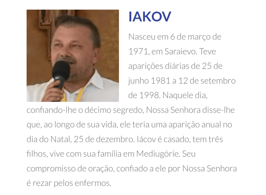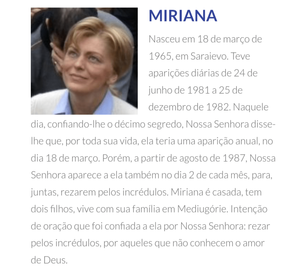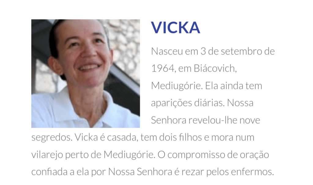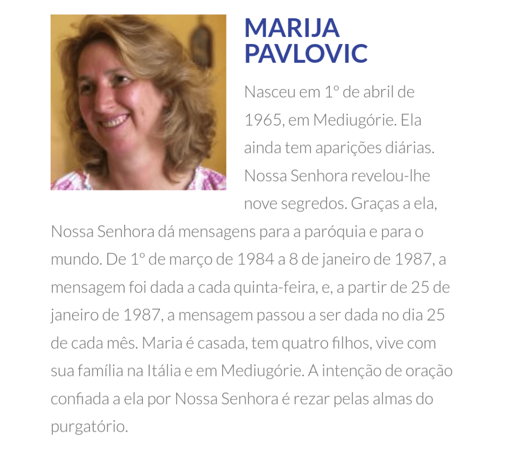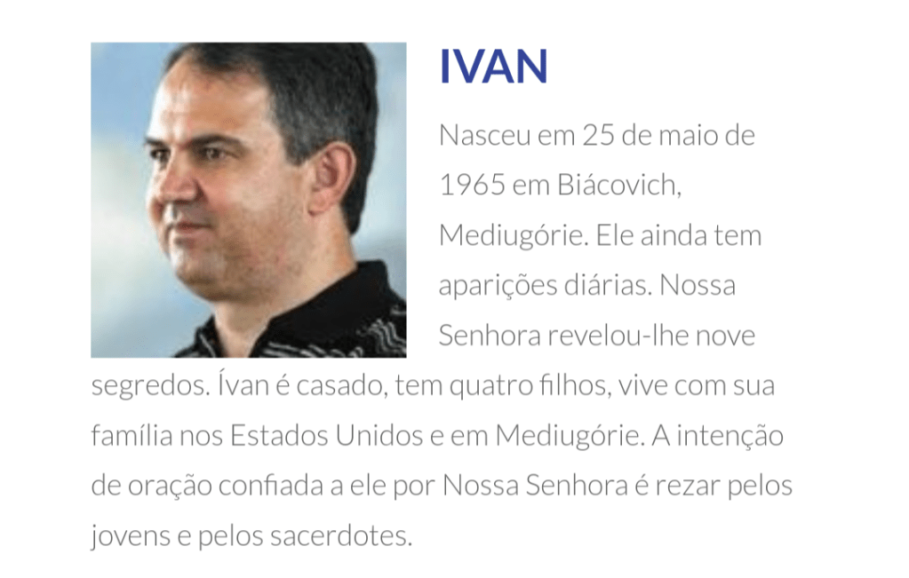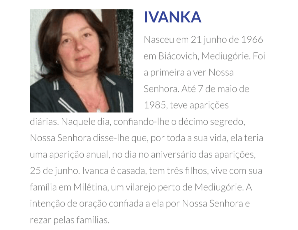 Desde 24 de junho de 1981 até hoje, seis videntes em Medjugorje, Ivanka Ivankovic-Elez, Mirjana Dragicevic-Soldo, Vicka Ivankovic, Marija Pavlovic-Lunetti, Ivan Dragicevic e Jakov Colo, unanimemente afirmam que Nossa Senhora está aparecendo a eles.