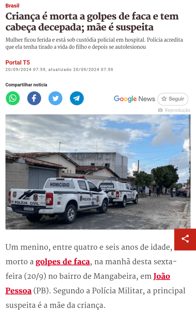 Mãe decepa cabeça da criança em João pessoa